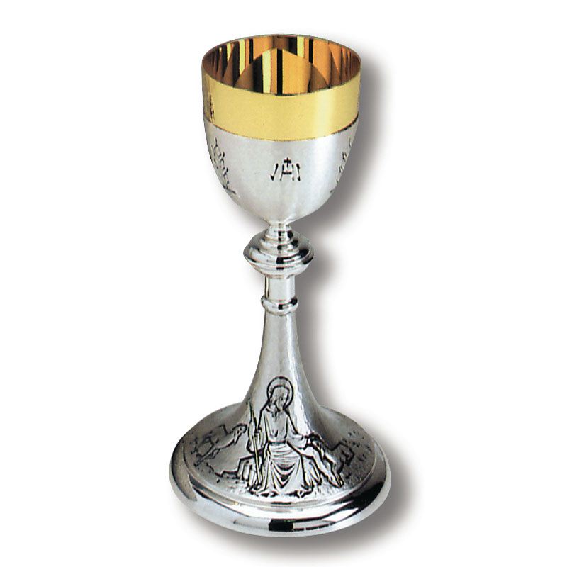 Calice argentato cesellato con Buon Pastore Calice argentato cesellato con Buon Pastore. Altezza cm 24. Cod.7454 - Altezza cm 24
