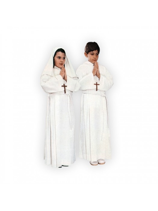Abito per Prima Comunione su misura, taglio monacale, in viscosa/poliestere, completo di crocetta e cordone. Semplice o con scapolare. A richiesta anche con cappuccio o velo (come in foto)