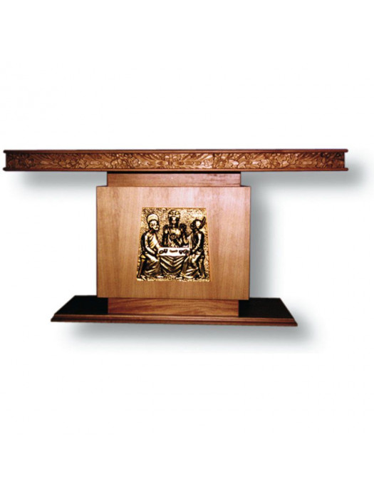 Altare in legno con fascia anteriore intagliata Altare in legno con fascia anteriore intagliata con pannello anteriore in bronzo fuso raffigurante la Cena di Emmaus, misura piano cm 70 x 180. Si vende anche senza pannello. Cod. 7033 - piano cm 70 x 180