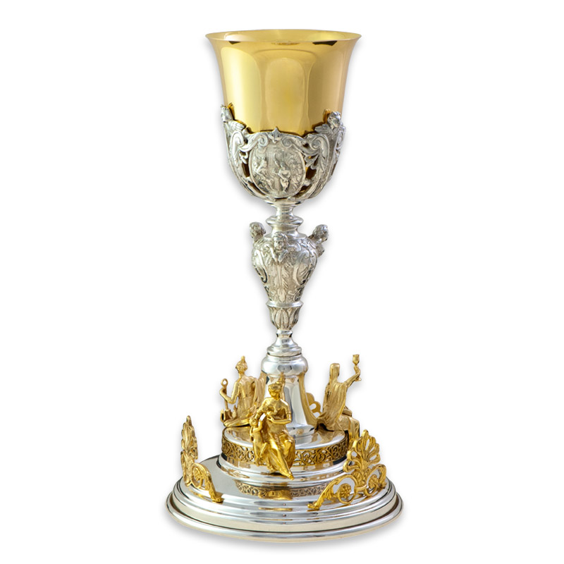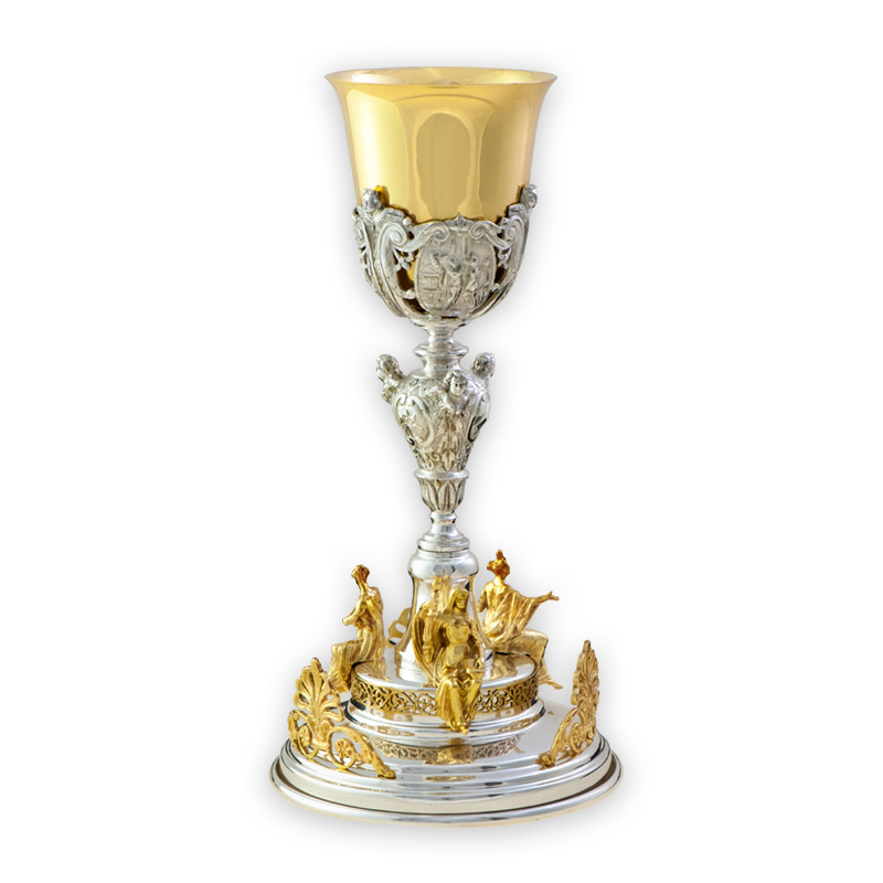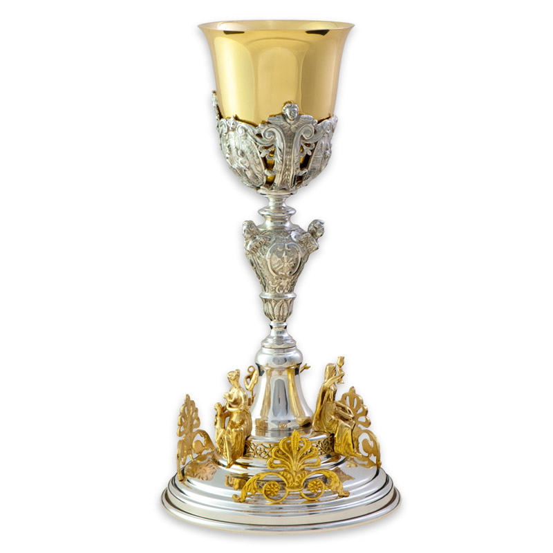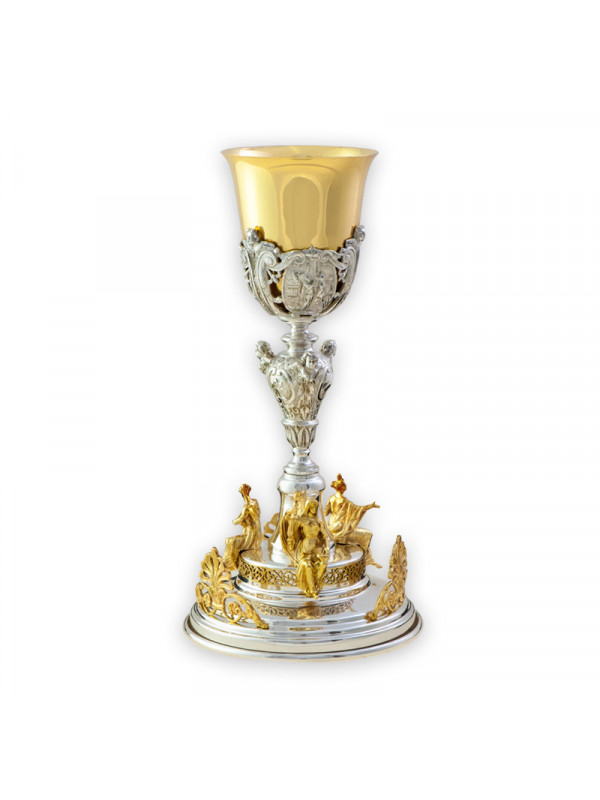 Calice tutto argento 925 con stattuette in argento massiccio raffiguranti le virtu teologali sulla base, nodo decorato con dei putini e sulla sottocoppa angioletti e scene della vita di Gesù
