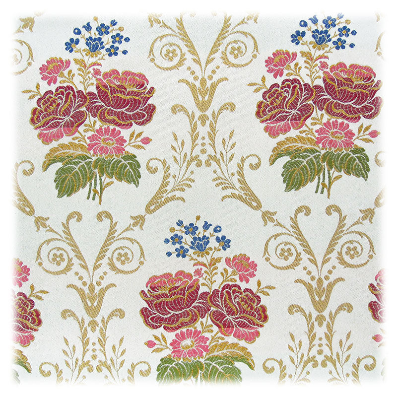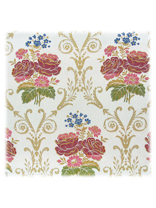 Ombrello Processionale in lampasso “giardino”, gallone e frangia dorati, diametro cm 100, struttura tradizionale in legno, a 10 stecche, corpo tornito a mano, bastone in due pezzi.
