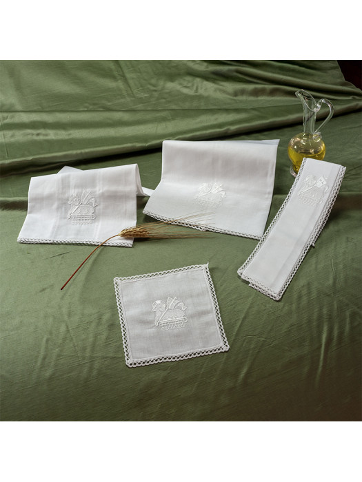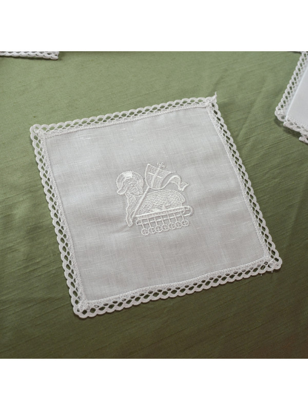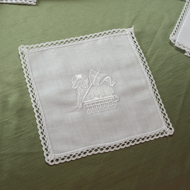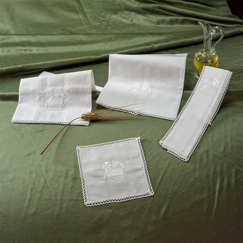 Altar linen set for Mass Service in mix linen, with Agnus Dei machine embroidered in cotton, complete of Manutergio, Corporal, Purificator, Pall and Manuterge