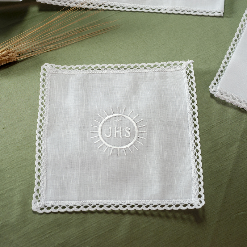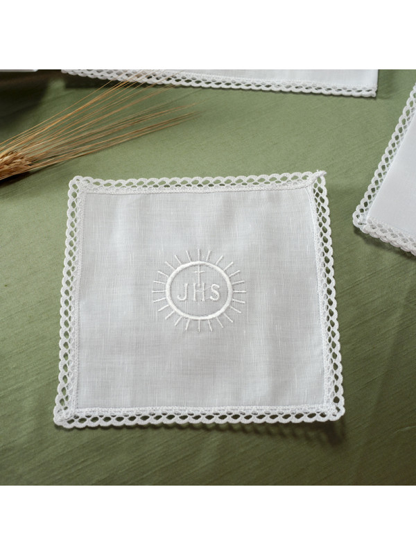 Altar linen set for Mass Service in mix linen, with machine embroidered JHS in cotton, complete of Corporal, Purificator, Pall and Manuterge