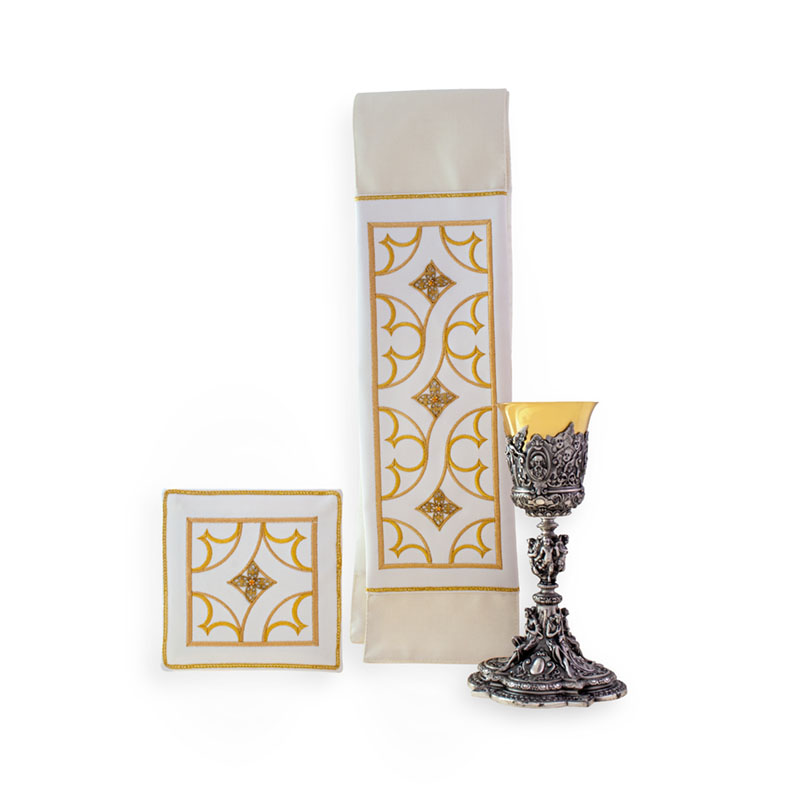 Chasuble in lightweight pure wool "saglia", satin orphrey, rich machine embroidery in modern style with applications in metal and crystal stones, complete with stole and chalice pall. The chalice in photo is not included