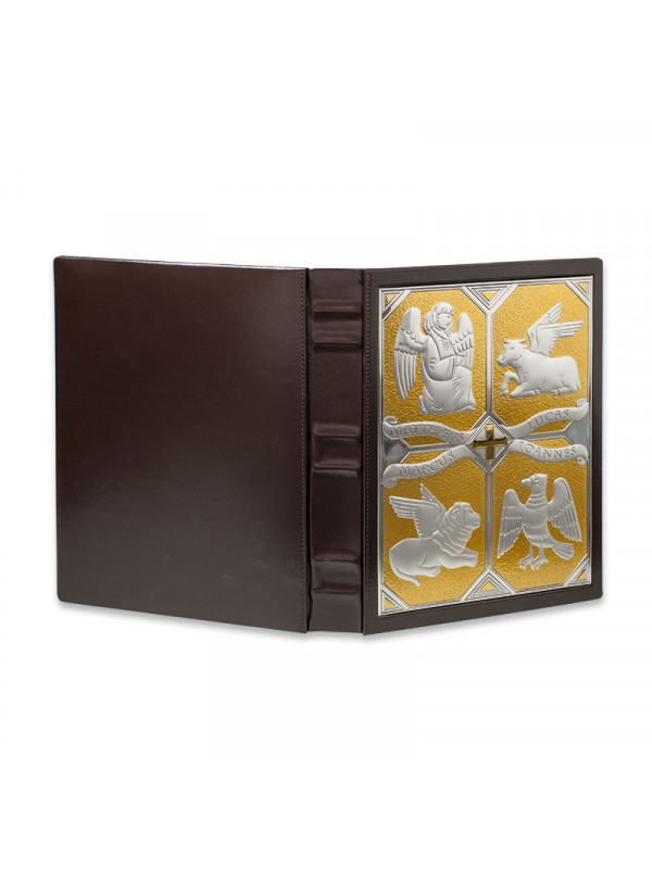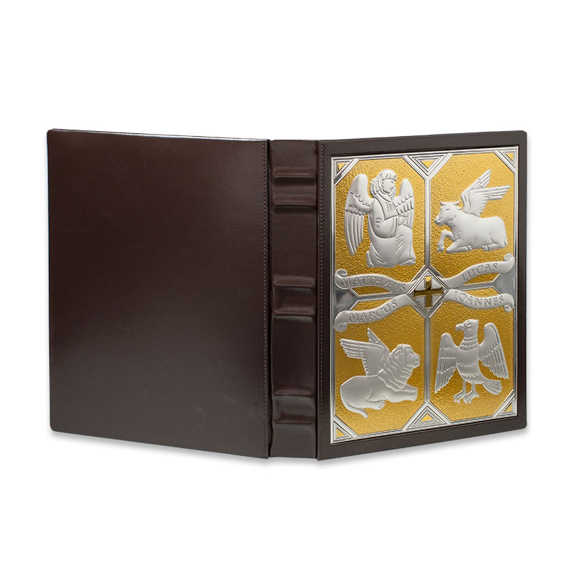 Coprilezionario o Coprimessale in cuoio, placca in argento con i simboli degli Evangelisti. Coprilezionario o Coprimessale grande in cuoio con placca frontale in argento 925 m/m raffigurante i simboli dei Quattro Evangelisti. Misura cm 32X24. Con placca solo sul lato anteriore (1 placca) o su entrambi i lati (2 placche) Cod. 7761 - Con placca solo sul lato anteriore o su entrambi i lati