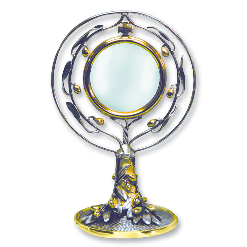 Chapel monstrance in chiseled metal, with olives and leaves in the round, two-tone finish, diameter cm 8, h cm 21