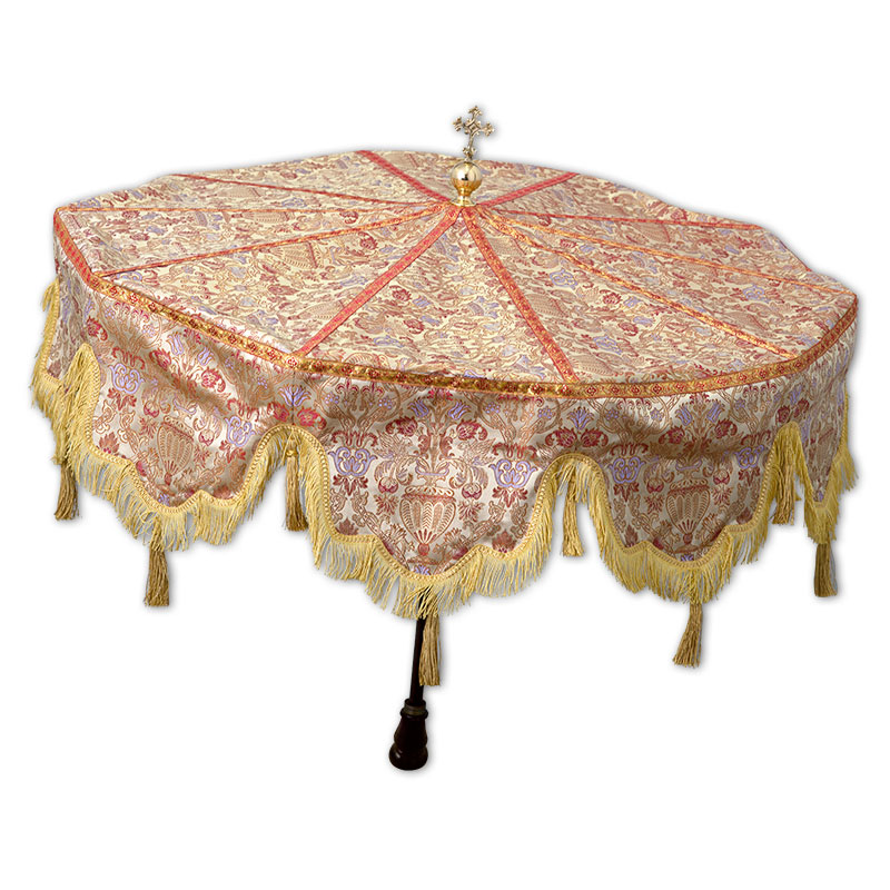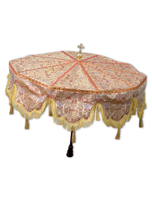 Processional Ombrellino in lampas “Garden Amphora” gold and red, fringe and tassels in gold color, diameter cm 100, traditional skeleton of the ombrellino hand-turned in wood, two pieces pole.