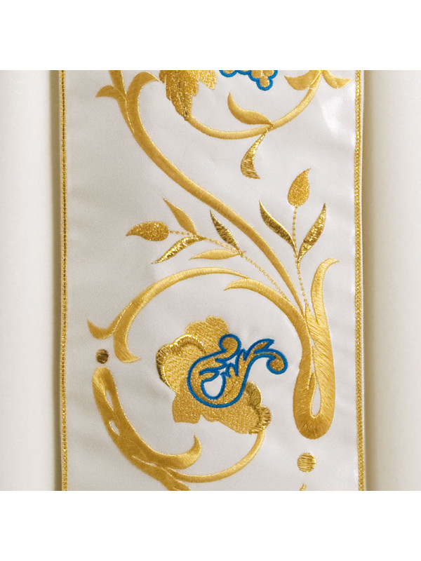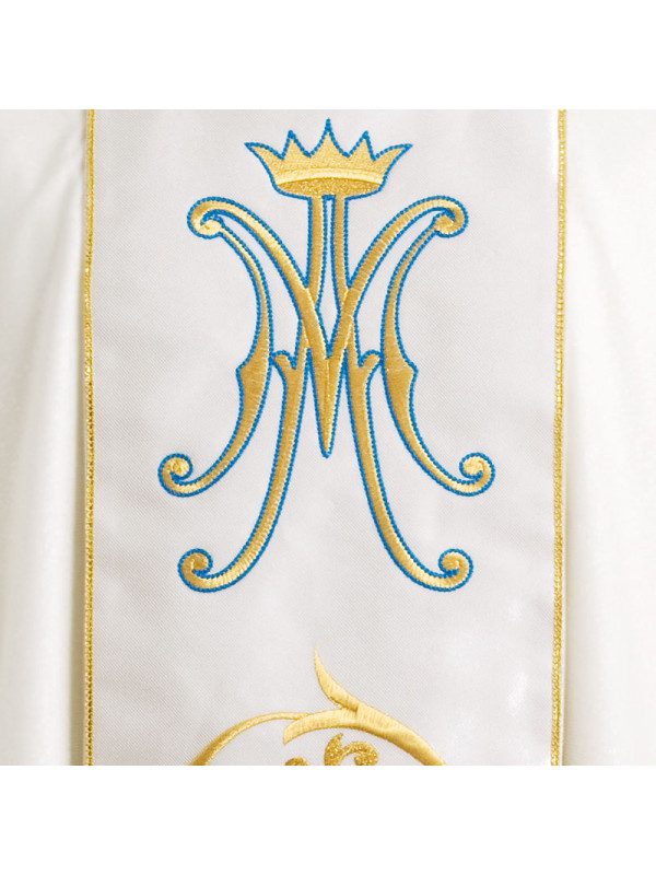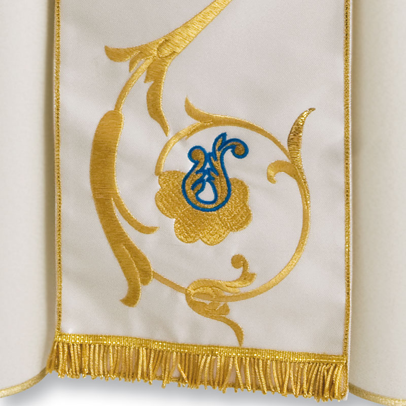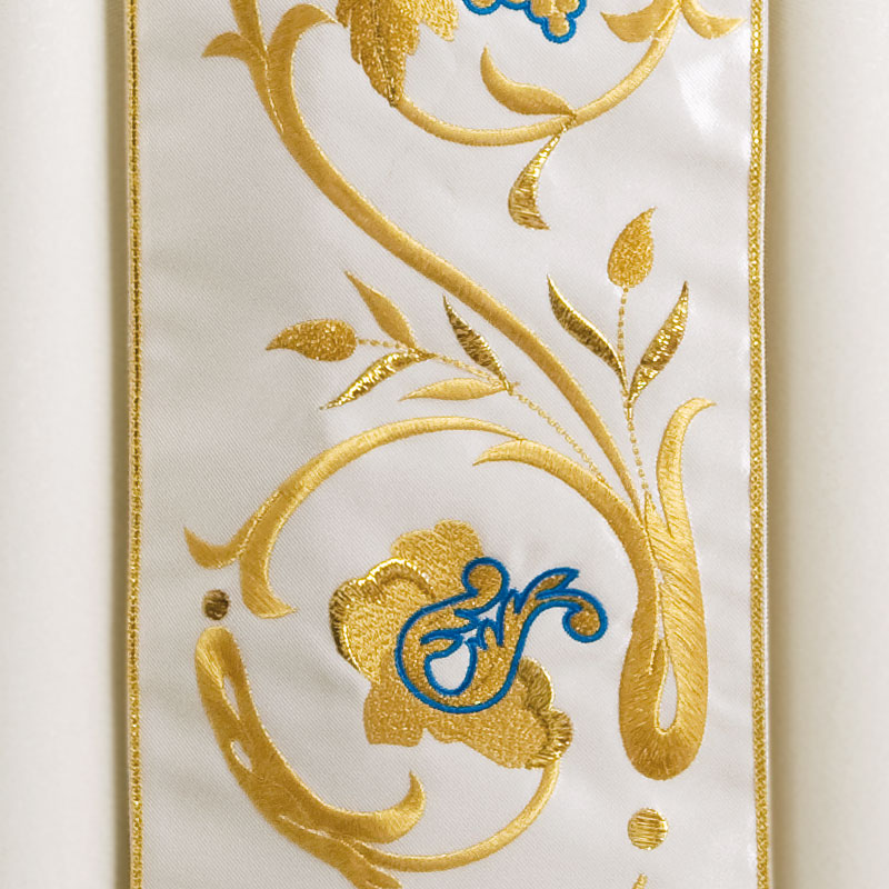Chasuble in wool "saglia", orphrey with Marian monogram and rich embroidery in various shades of gold and silk, golden hem at the edge