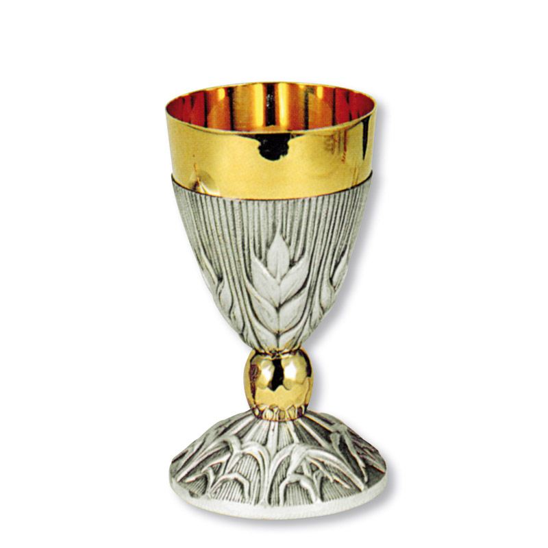 Calice in metallo argentato con spighe a bassorilievo, nodo dorato Calice in metallo argentato con spighe a bassorilievo, nodo dorato. Altezza cm 18. Cod. 11372 - Altezza cm 18
