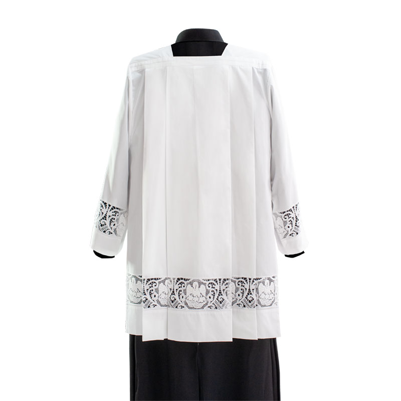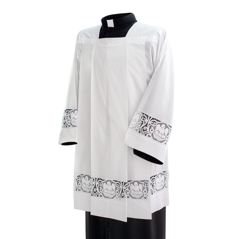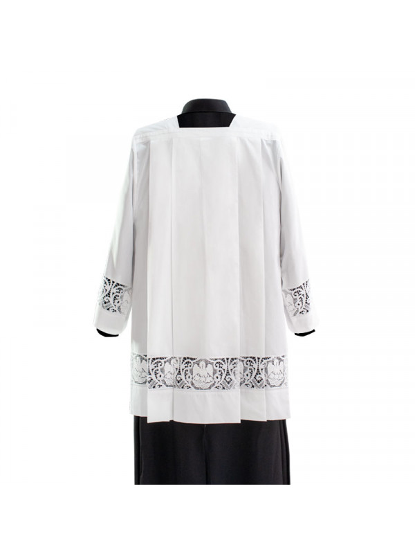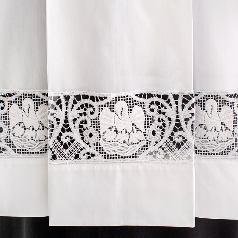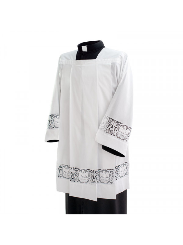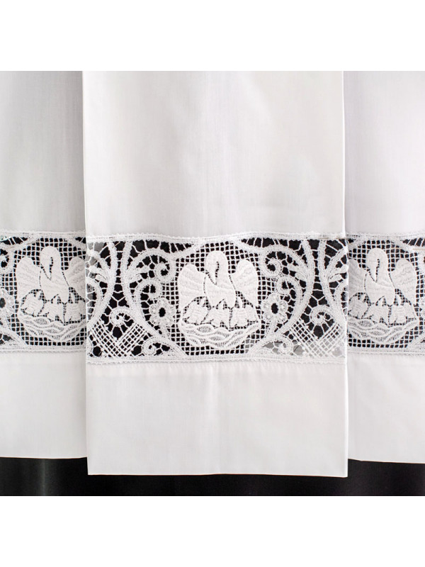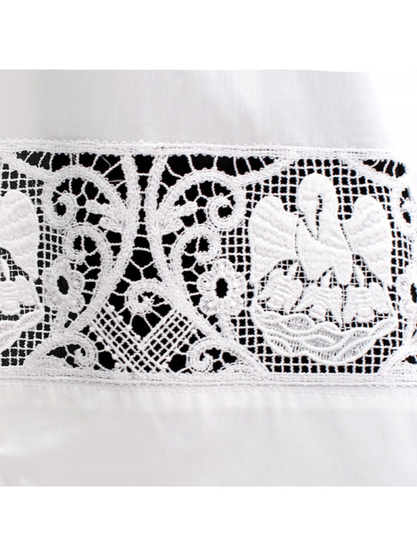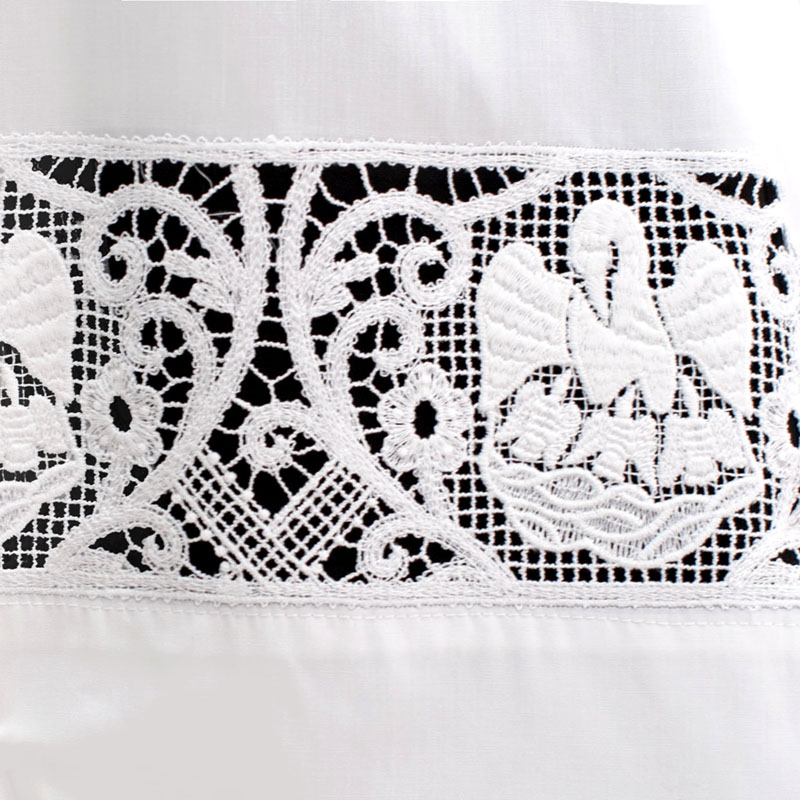 Surplice in mix cotton, with macramé partition depicting the Pelican, made with a square neck and four pleats. The size is the distance from the base of the neck to the lower edge of the surplice. See attached figure