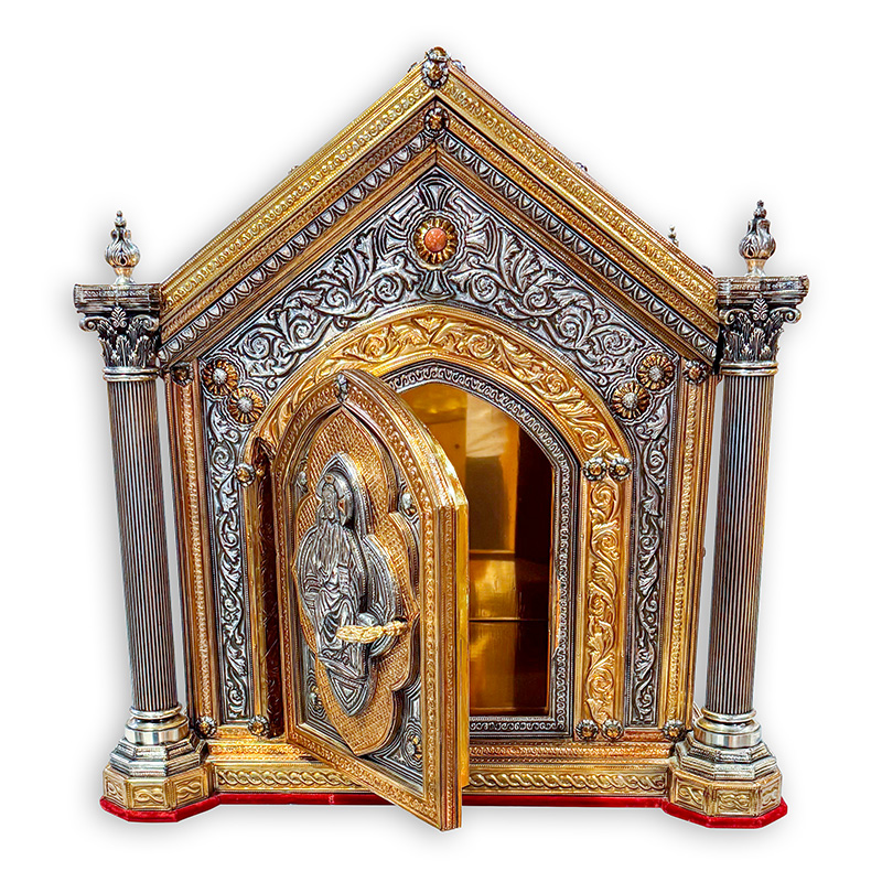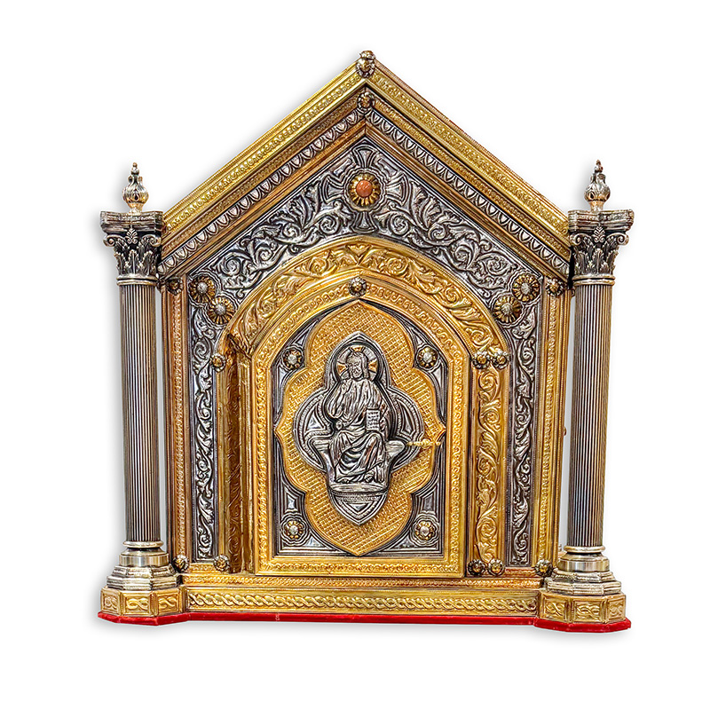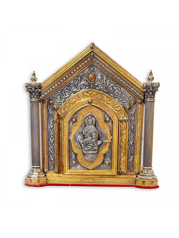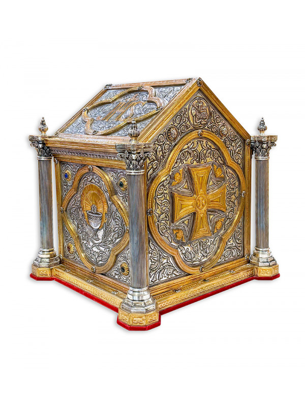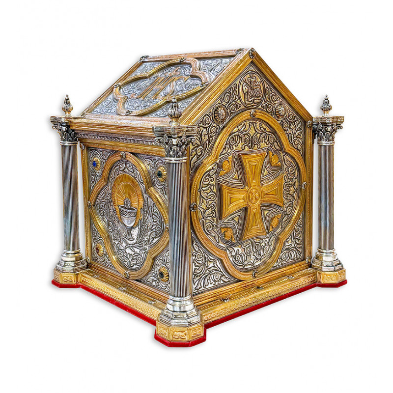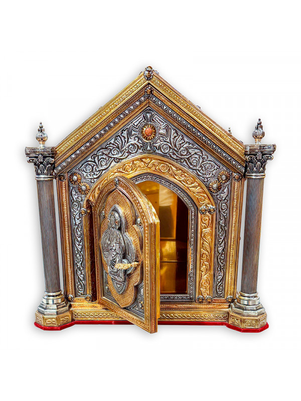 Tabernacle in 999/000 silver foil, entirely embossed and hand-worked by a master engraver, artisan masterpiece, metal frame, size approx. 54x54x47 cm, two-tone finish with gold-plated parts