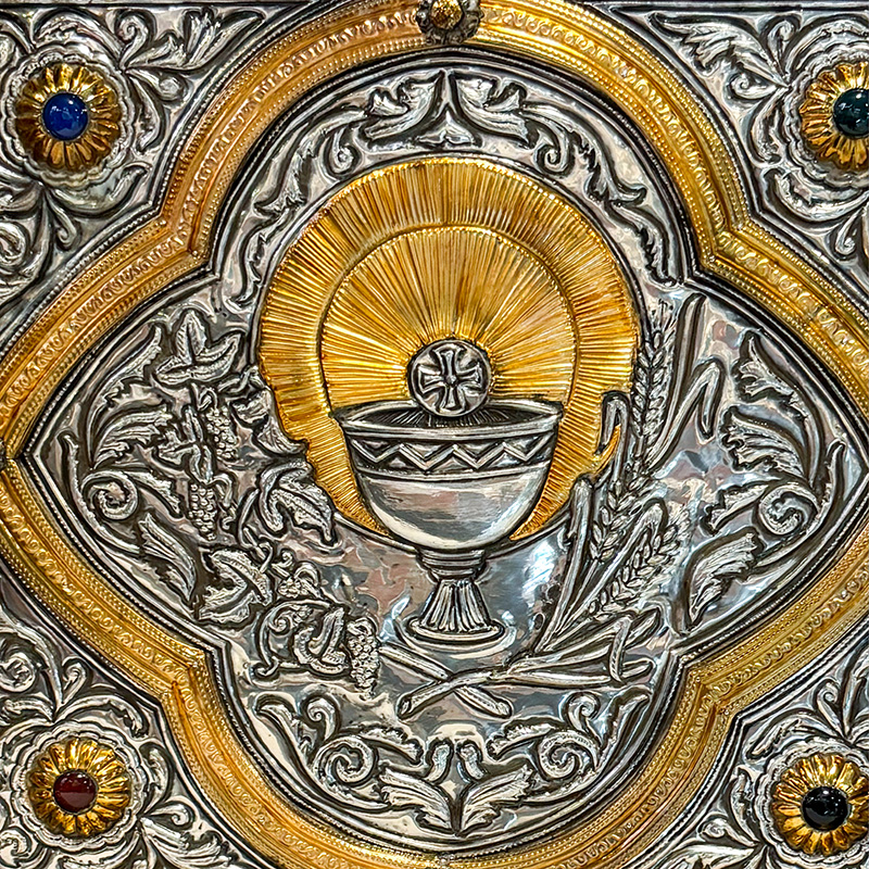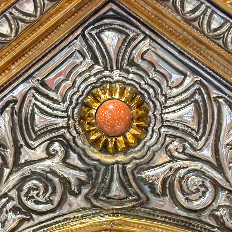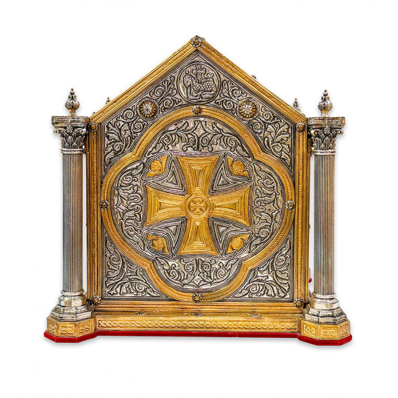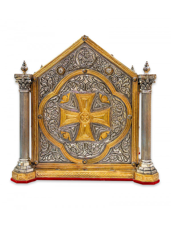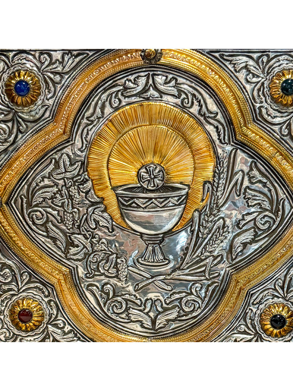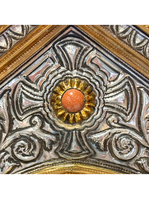 Tabernacle in 999/000 silver foil, entirely embossed and hand-worked by a master engraver, artisan masterpiece, metal frame, size approx. 54x54x47 cm, two-tone finish with gold-plated parts