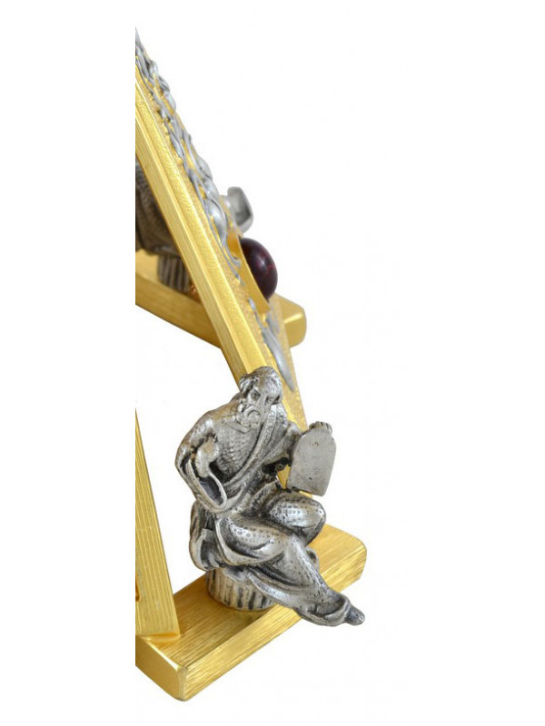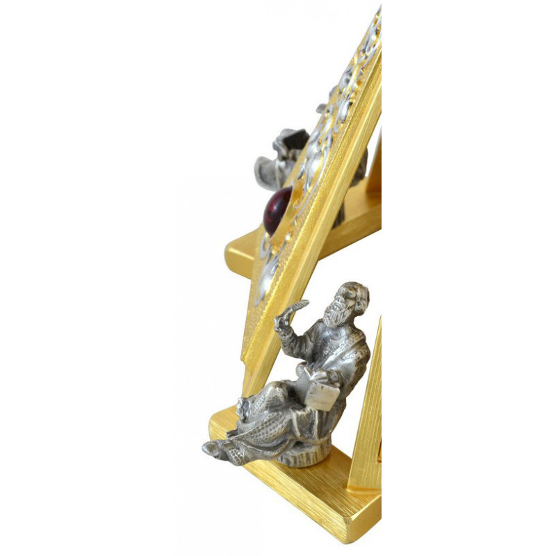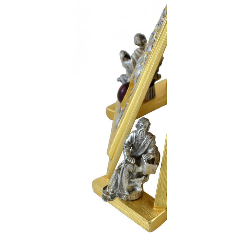 Tabor en bronce dorado y plateado, estatuillas de querubines y cuatro Evangelistas en fundición a la cera perdida finamente cincelados y plateados, cabujones rojos, altura cm 22,5, diámetro del plano superior cm 24,5