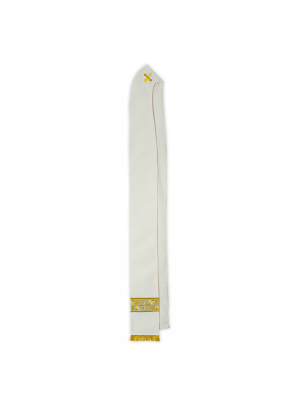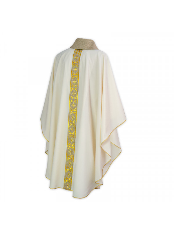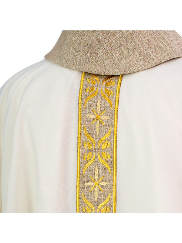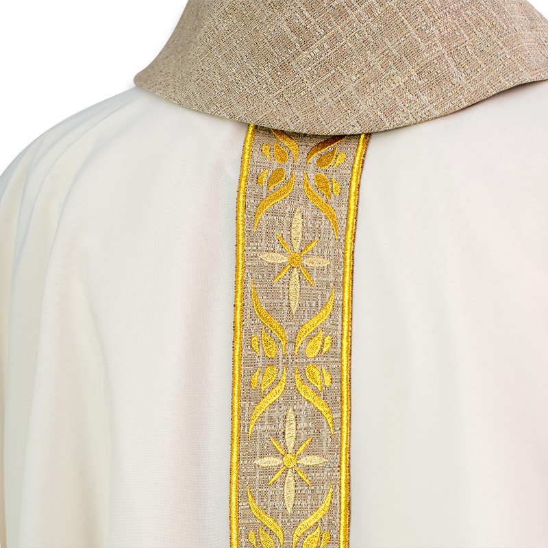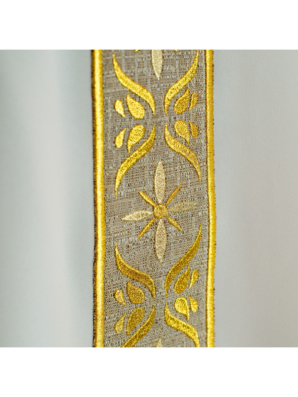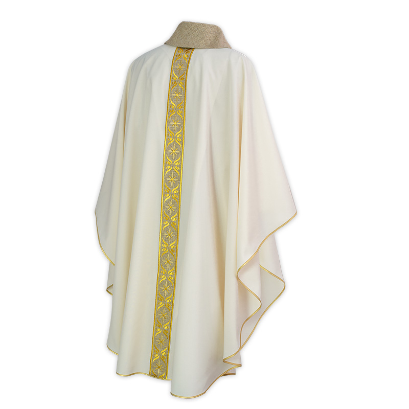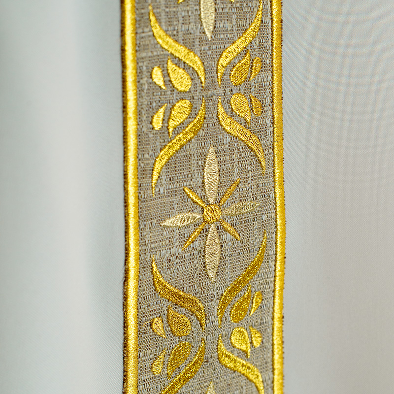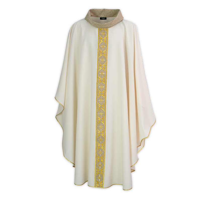 Casulla de poliéster con cintas bordadas, completa con estola, disponible en 4 colores litúrgicos