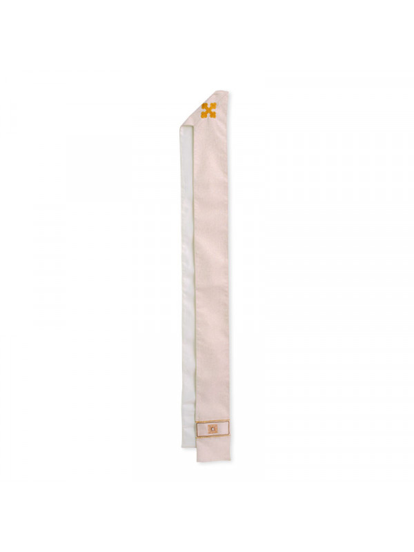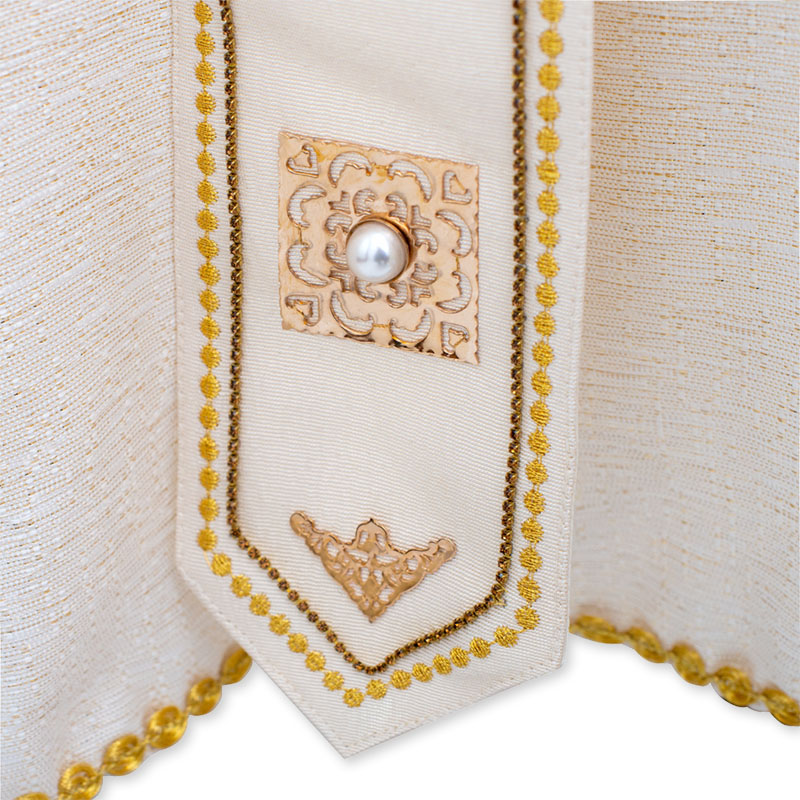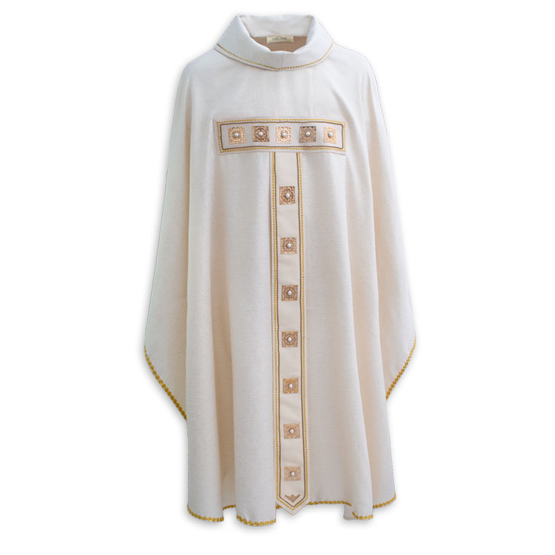Casulla de tejido laminado de color marfil, adornada con aplicaciones a mano de metal y gemas, detalles bordados a máquina