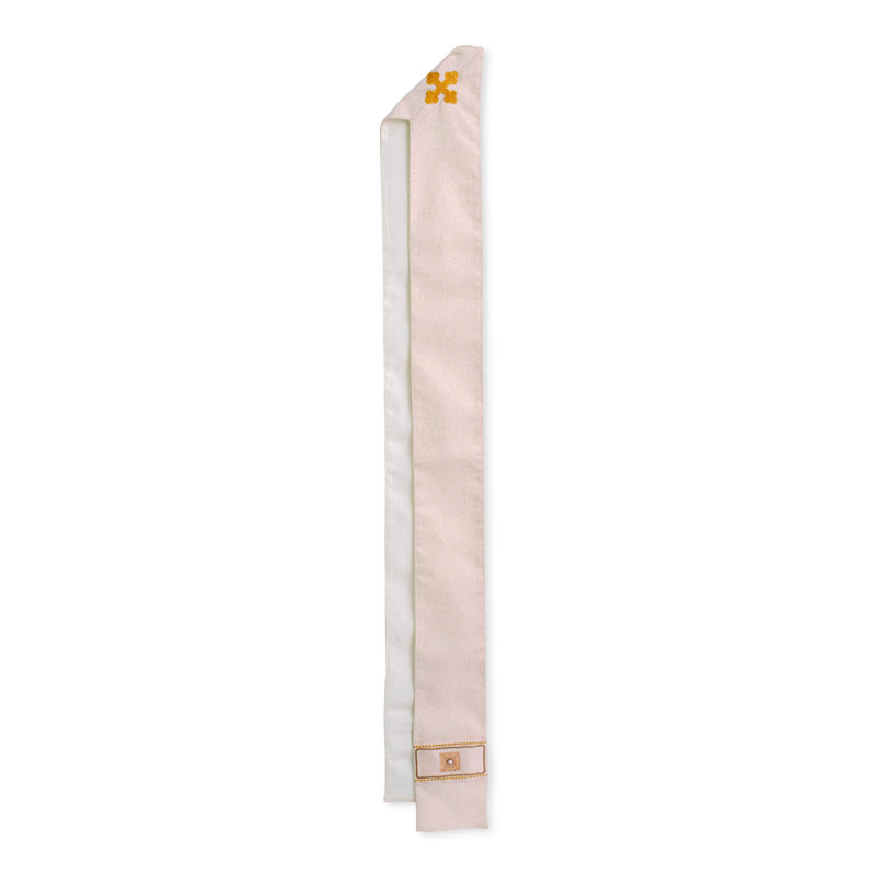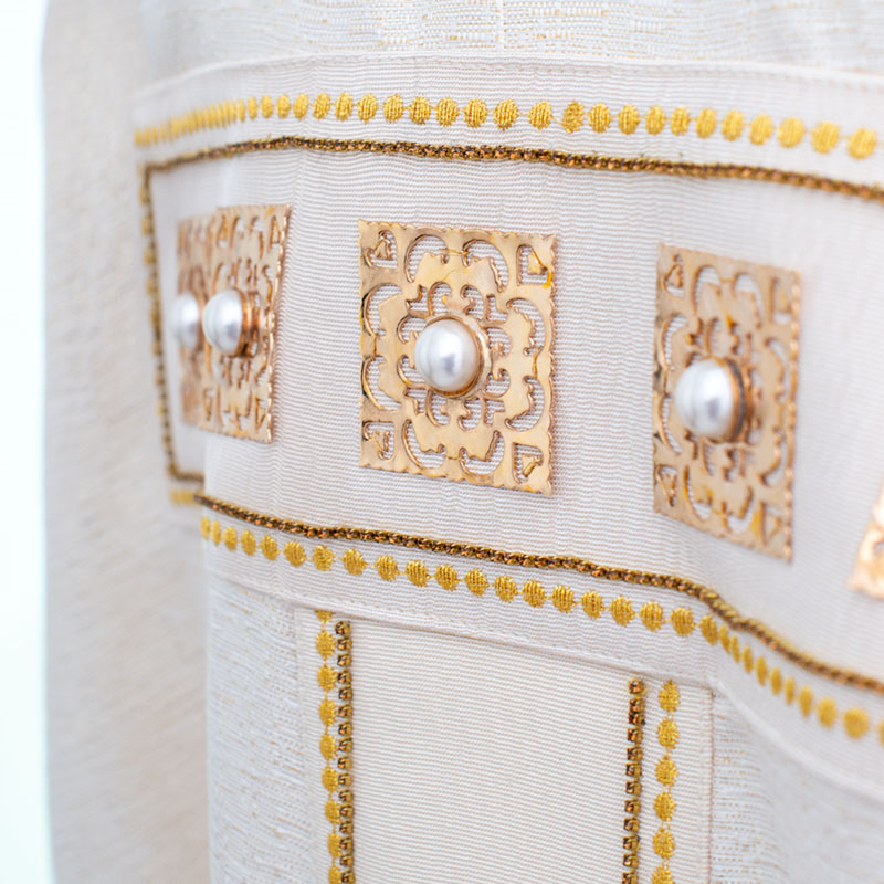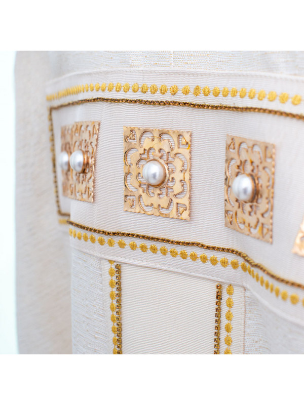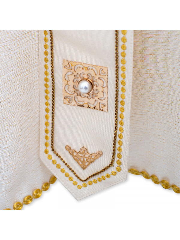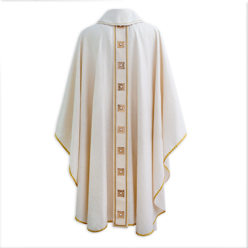 Casulla de tejido laminado de color marfil, adornada con aplicaciones a mano de metal y gemas, detalles bordados a máquina
