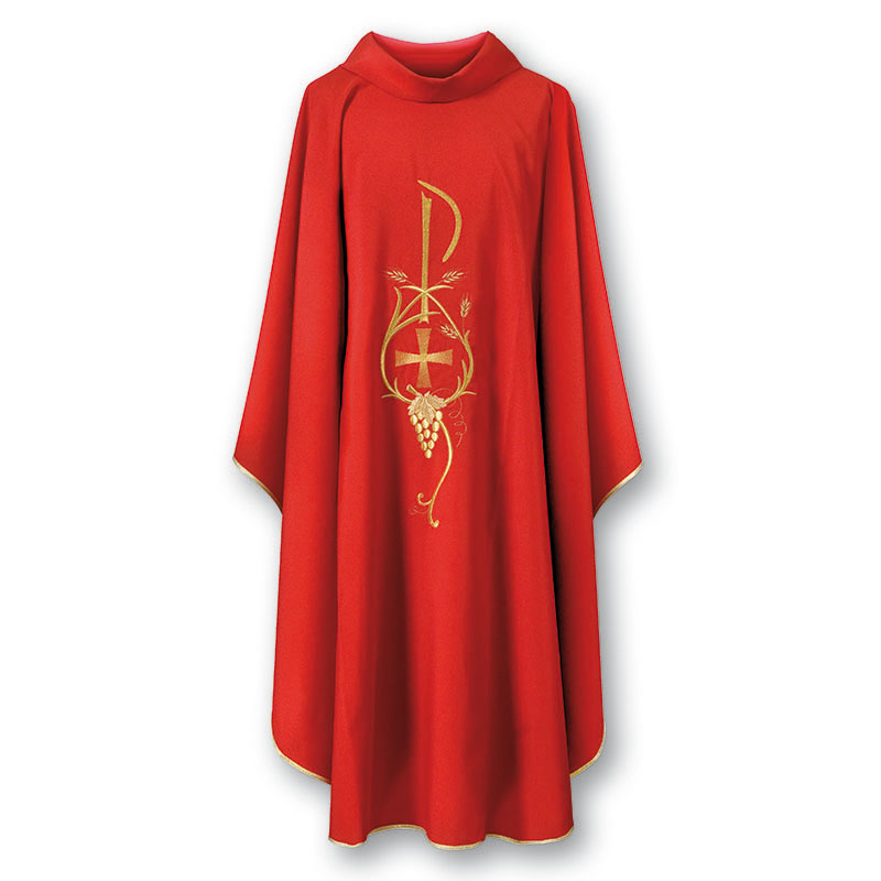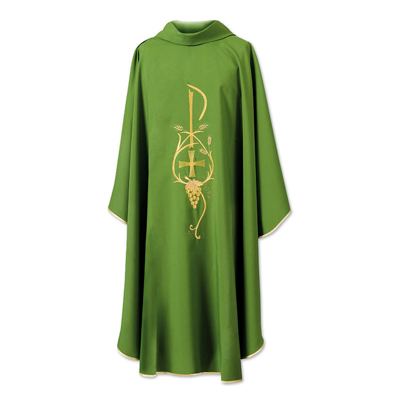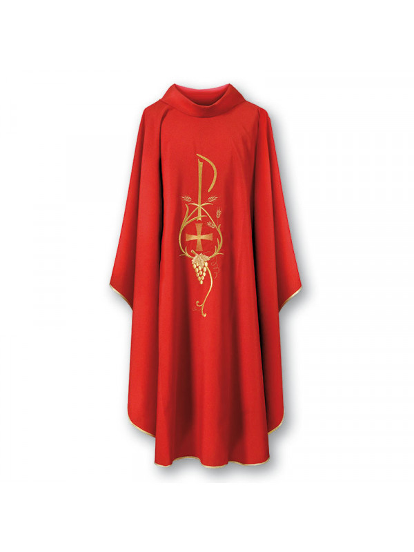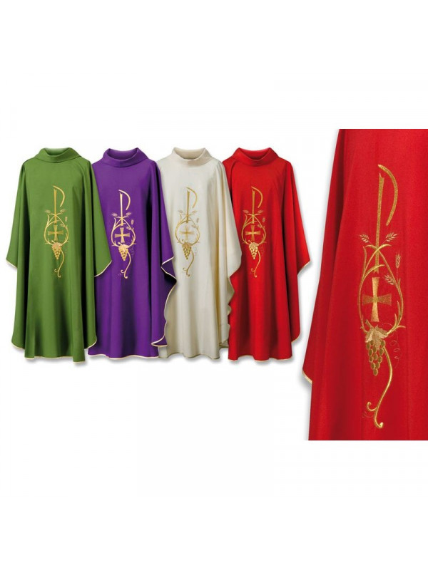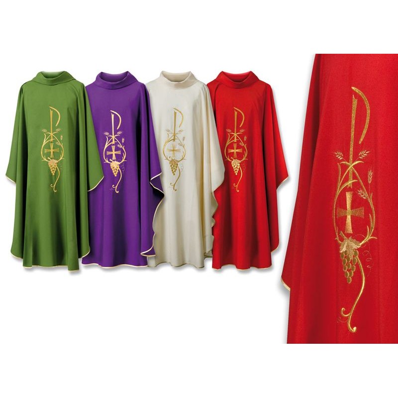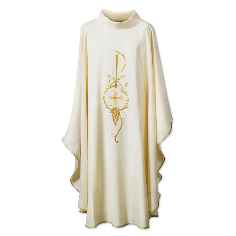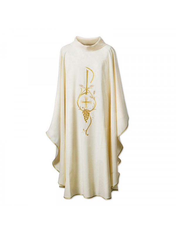 Casulla en poliéster con símbolos litúrgicos bordados en varios tonos de oro, bordes con dobladillo dorado