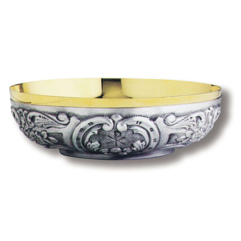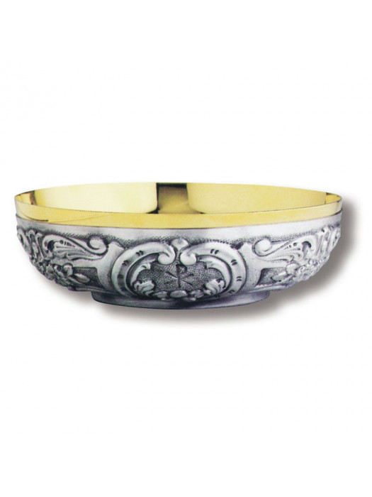Pisside offerta in metallo, parte inferiore argentata e cesellata a rilievo Pisside offerta in metallo, parte inferiore argentata con ornato in stile barocco cesellato a rilievo. Diametro cm 15 Cod. 9293 - Diametro cm 15