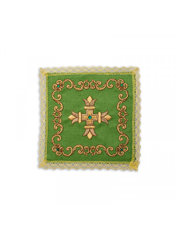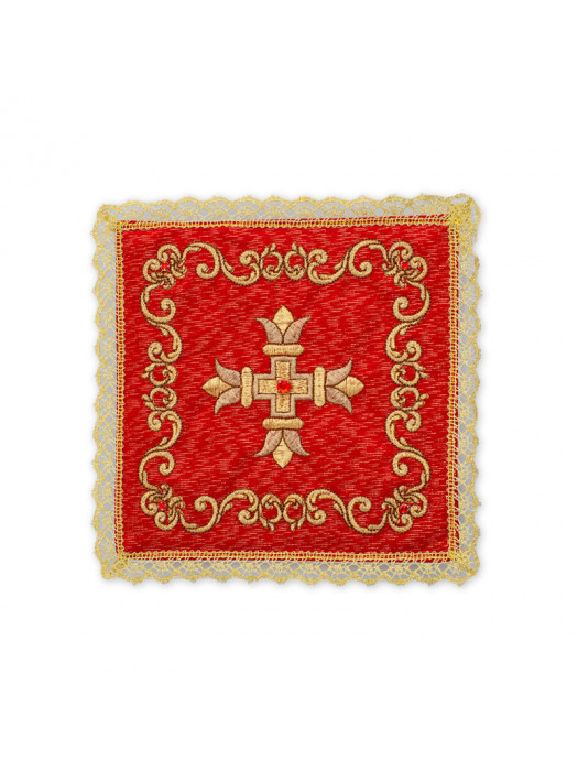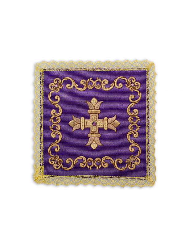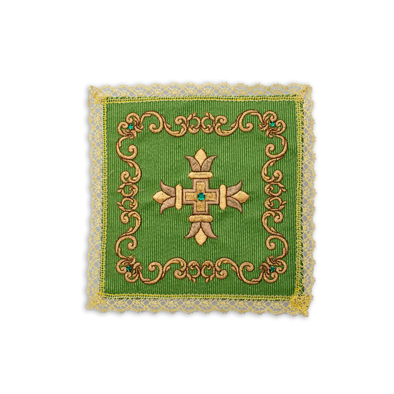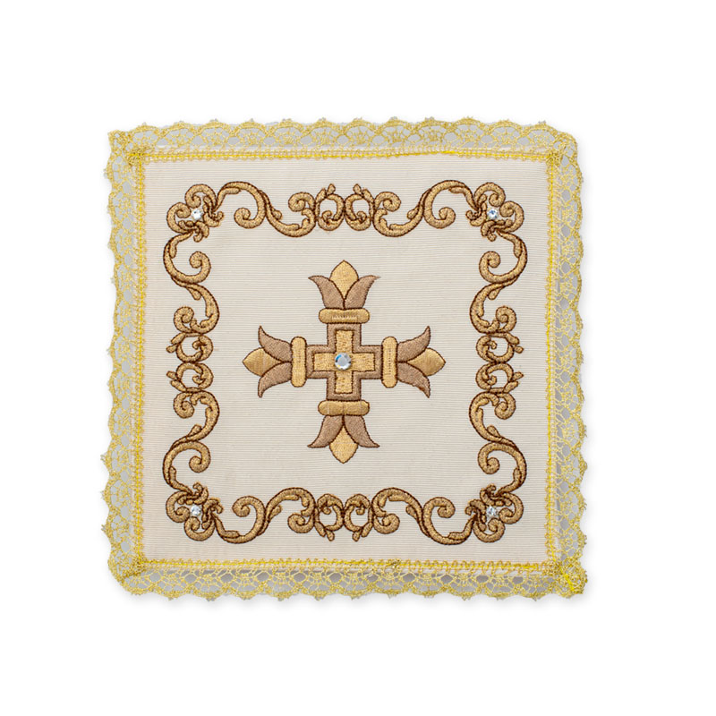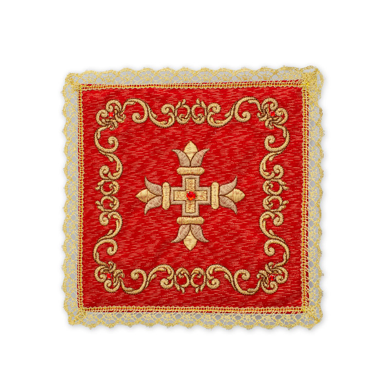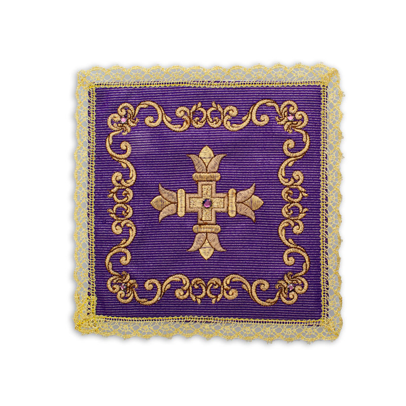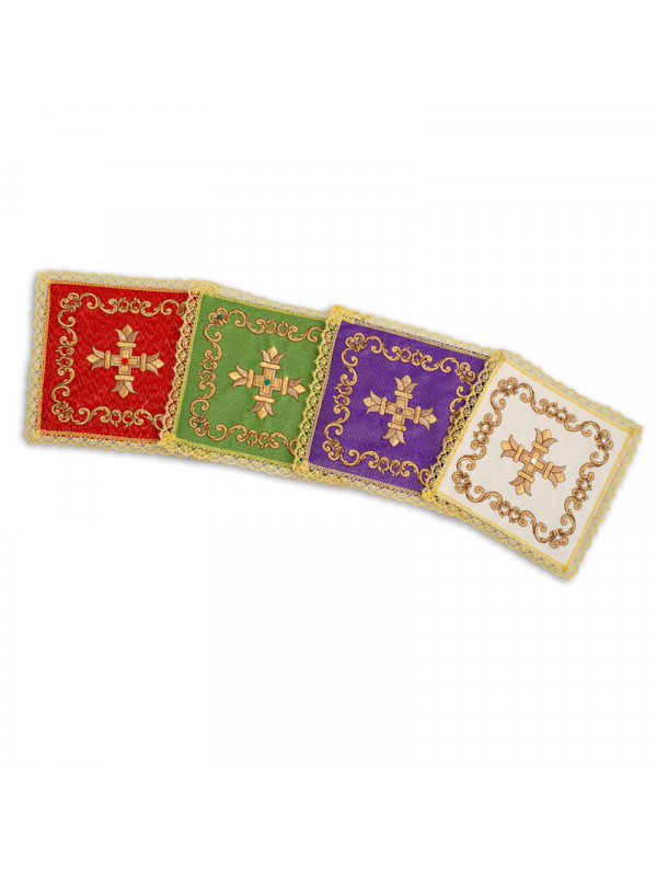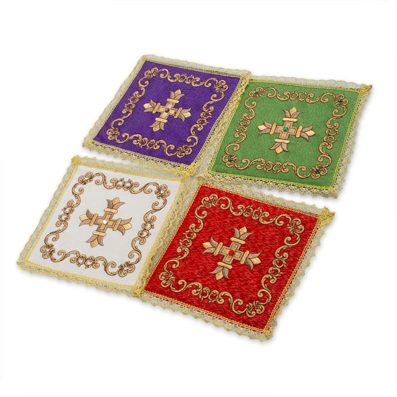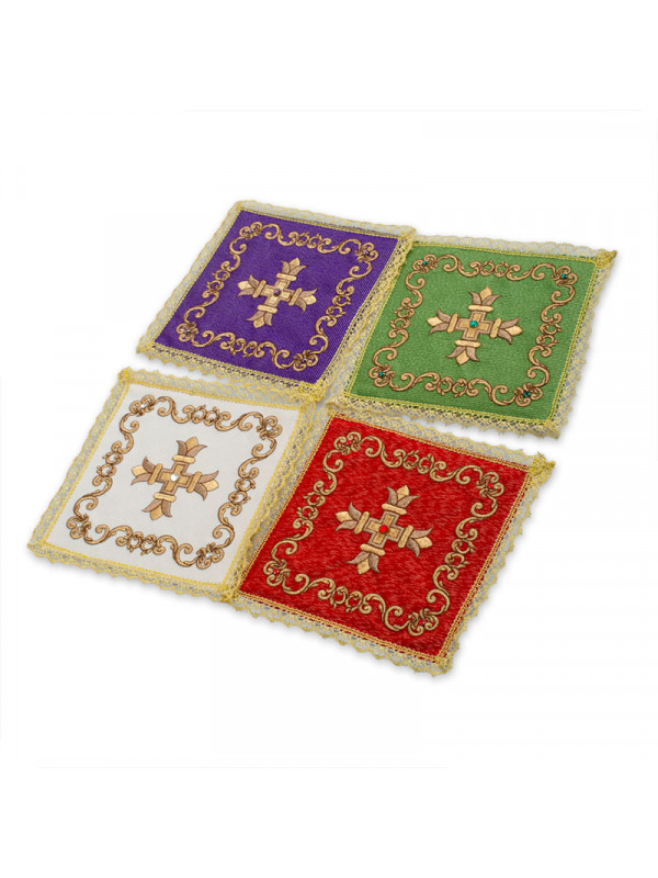 Palla in lamiglia, ricamata a macchina confezionata con agremano dorato all’orlo, disponibile nei colori liturgici