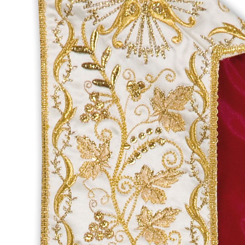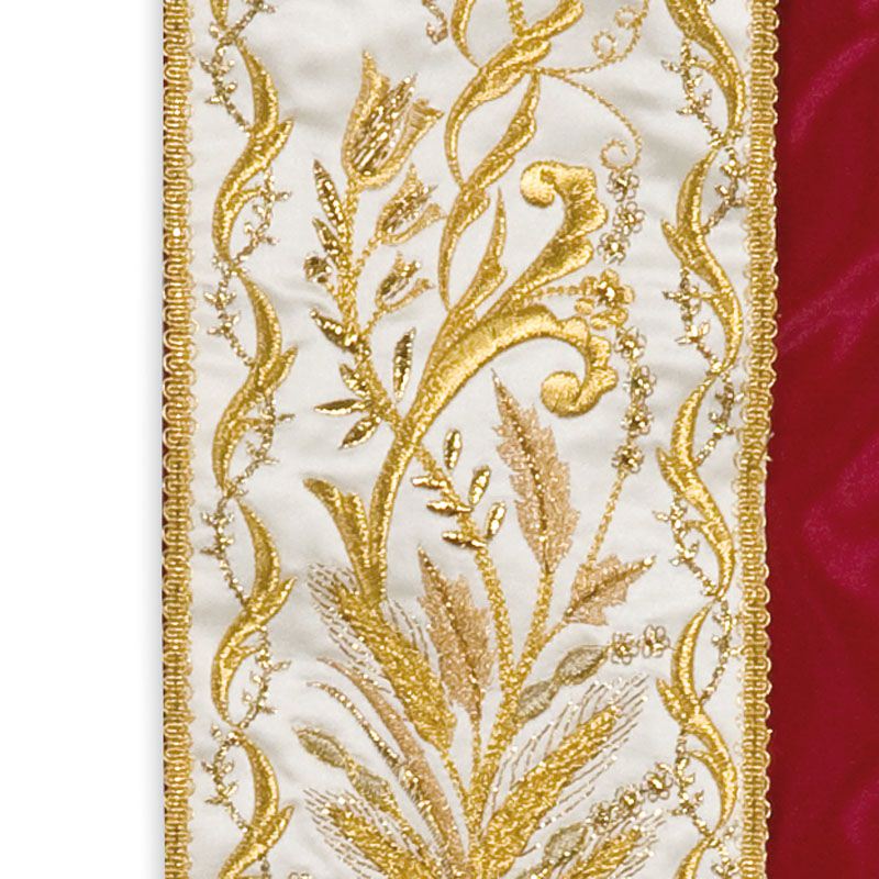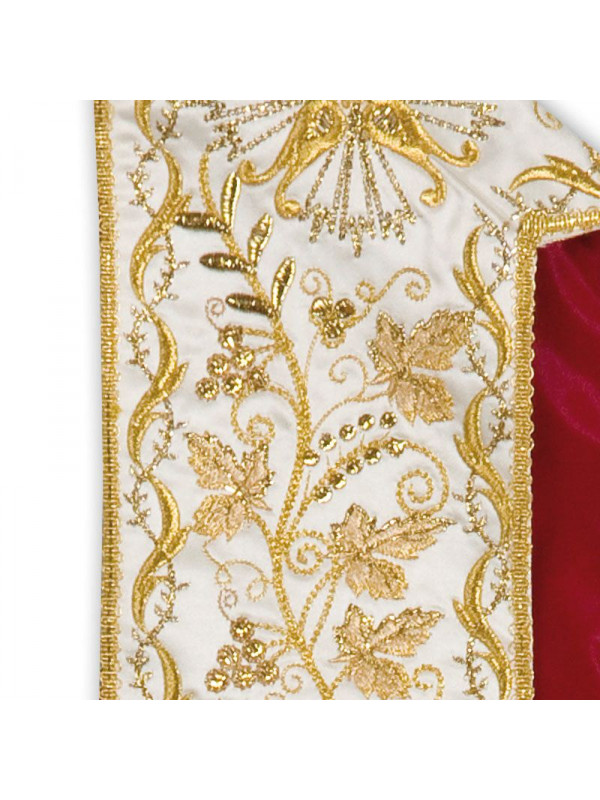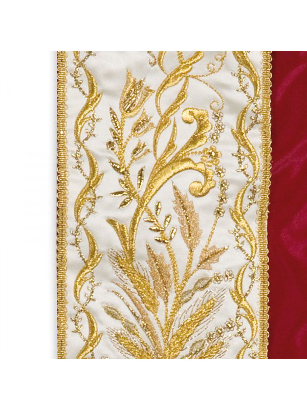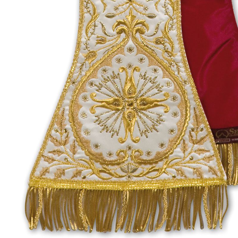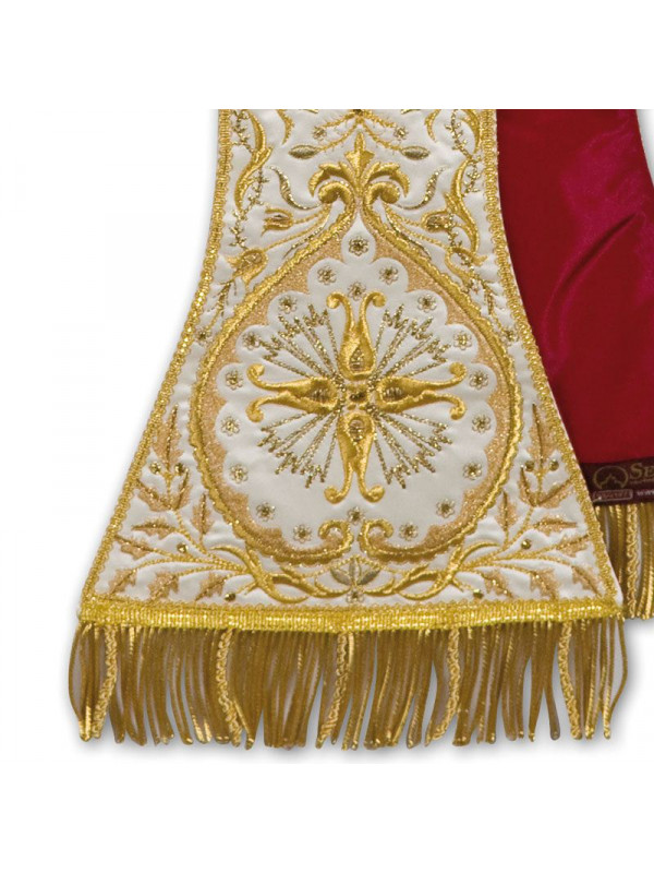 Stola disegno classico stile ‘700, in raso, ricchi ricami in vari toni di oro, imitazione ricamo a mano, frangia e fiocchi in oro a canutiglia con torciglioni