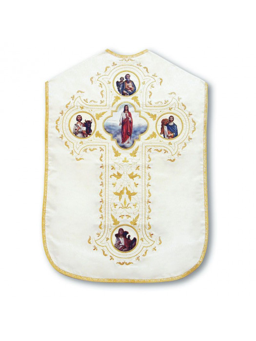 Pianeta in raso, fini ricami in oro, galloni dorati, figure del Cristo, degli Evangelisti e due angeli in preghiera applicate, completa di sola stola o con i quattro pezzi tradizionali: manipolo, stola, velo per calice e borsa